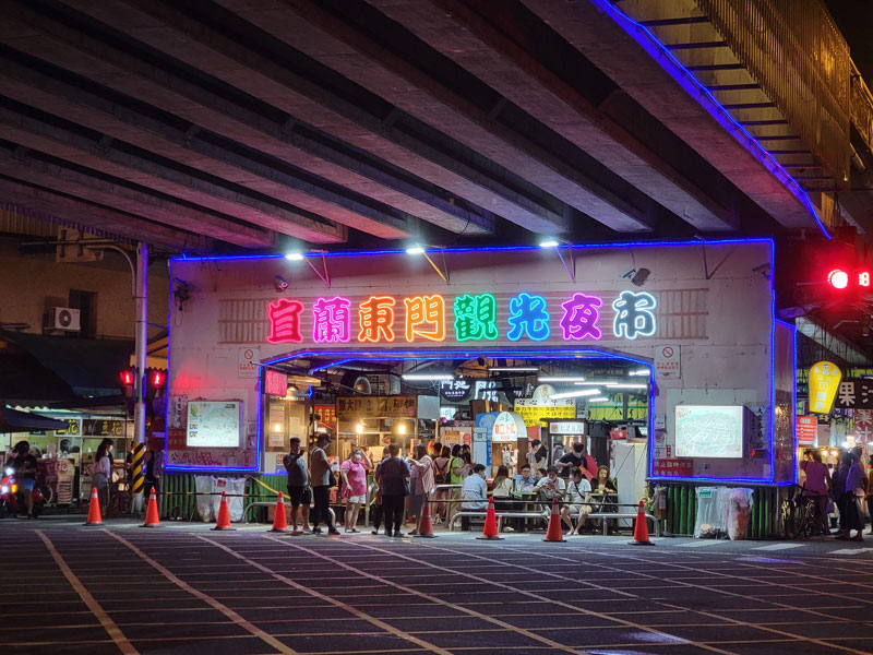 東門夜市坐落於宜蘭市東港陸橋下方(前身是三角公園,隨著東港陸橋的擴建,成為現在的夜市),從宜蘭火車站出站右轉宜興路一段,步行約300公尺即可抵達。沿著聖後街、和睦路走,可以感受宜蘭東門夜市的熱鬧非凡,是宜蘭市區的不夜城,也是在地人必逛的地方。